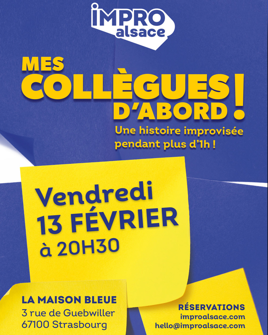Mes collègues d’abord est LE spectacle longform d’IMPRO Alsace. HEIN ? Longform ? Le longform est une forme de spectacle d’improvisation théâtrale qui consiste à créer intégralement une pièce de théâtre improvisée. Nous prenons quelques suggestions du public au début du spectacle, puis nous improvisons non-stop durant 1 heure ! C’est comme une pièce de théâtre écrite, sauf que celle-ci n’est pas écrite ! Mes collègues d’abord est un spectacle où le public suggère un lieu de travail à nos comédiens et ceux-ci vont vous montrer la vie animée de cette entreprise et de ses collaborateurs. Un.e metteur.se en scène sera présent.e afin de donner occasionnelement des consignes et enrichir ce qui sera déjà proposé par les commédien.ne.s.
