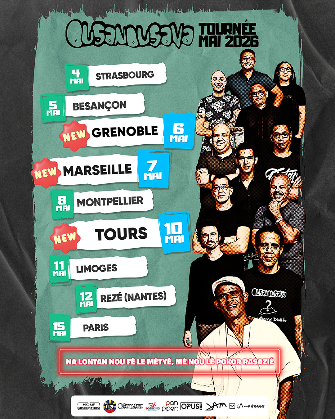 Pour la tournée 2026 qui s’annonce, le groupe proposera un spectacle entier qui fera la part belle aux titres les plus célèbres de son répertoire, en visitant au plus près les différents albums… Les musiciens (8 sur scène – presque un big band !) auront à cœur de faire voyager l’auditeur au son du maloya, du séga et bien d’autres rythmes.
